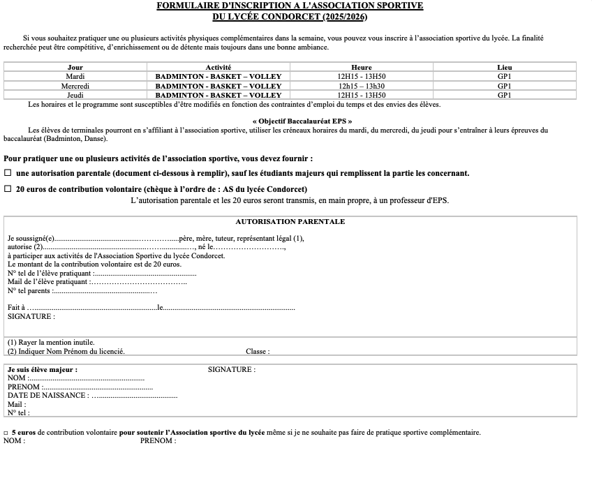 Formulaire d’inscription à l’Association sportive 2025-26