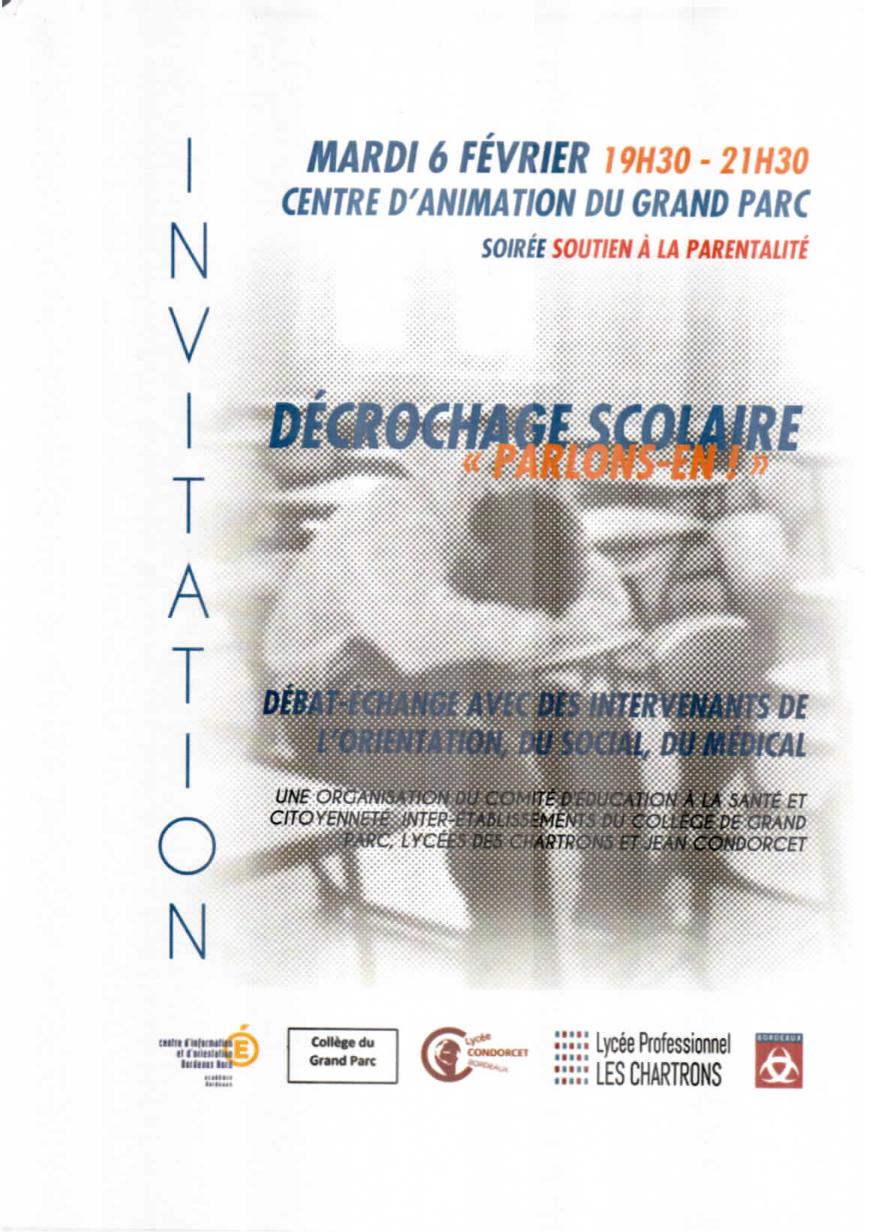6 février 2018 : Soirée parents sur le décrochage scolaire La nouvelle soirée parents se déroulera le mardi 6 février 2018 de 19h30 à 21h30 au Centre d’animation du Grand parc sur le thème du décrochage scolaire. Soirée ouverte à tous les publics (gratuit)